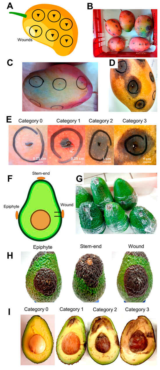 Inoculation procedure for rot symptom development in preliminary assays for symptom establishment. (A,F) Drawing that represents the strategies used in the inoculation of fungal pathogens in mango (A) and avocado (F). (B,G) Inoculated fruits ready for incubation at room temperature for seven days. (C) Mango fruit recently inoculated with fungal suspension. (D) Superficial rot symptoms were observed on mango skin after seven days of incubation at room temperature. (E) Categories of severity used in mango artificial infection assays. Category 0 means no symptoms, Category 1 includes a necrotic area less than 0.5 cm in diameter, Category 2 includes a necrotic area from 0.5 to 2 cm in diameter, and Category 3 includes a necrotic area more than 2 cm in diameter. (H) Superficial rot symptoms observed on avocado skin after eight days of incubation at room temperature at the three different inoculation points. (I) Categories of severity used in avocado artificial inoculated assays. Category 0 means no symptoms, Category 1 includes less than 25% of the necrotic area, Category 2 includes 25% of the necrotic area, and Category 3 includes more than 25% of the necrotic area.