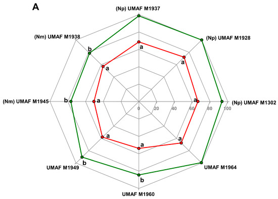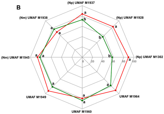 Radar representation of the percentage of growth (0–100%) of undetermined Neofusicoccum spp., Neofusicoccum parvum (Np), and Neofusicoccum mediterraneum (Nm), isolated in the current study against antagonist bacteria Bacillus velezensis UMAF6639 fermented in red and Pseudomonas chlororaphis PCL1606 in green. Values with letters show statistical significance in comparison with the control without bacteria. Values with different letters show significant differences between Bacillus and Pseudomonas levels of action relative to the control. (A) Percentage of growth of isolates by the dual technique for the antagonism test. (B) Percentage of growth of isolates incubated in front of antagonist bacteria for volatile organic compound analysis. The statistical analysis was conducted by one-way ANOVA using SPSS software 11.0.