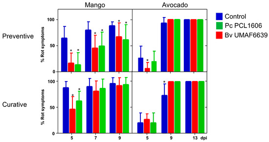 Percentage of rot incidence in the artificial infection experiment in mango and avocado fruits treated with antagonist bacteria Pseudomonas chlororaphis PCL1606 (green) and fermented Bacillus velezensis UMAF6639 (red). Sterile water with 1 mL L−1 of adjuvant was used as a treatment control (blue). The cumulative incidence is analysed in preventive and curative treatment applications. Significant differences in the treatment compared to the control are marked with asterisks. The statistical analysis was conducted by Student’s t-test using SPSS software 11.0.