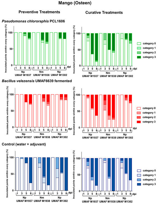 Severity symptom evolution on mango variety Osteen for eight days caused by three different fungi, Neofusicoccum parvum (UMAF M1937 and UMAF M1302) and N. mediterraneum (UMAF M1938). The symptom severity was analysed in fruits treated with Pseudomonas chlororaphis PCL1606 at a dose 106 CFU mL−1 with an adjuvant of 1 mL L−1 (in green) and fermented Bacillus velezensis UMAF6639 at a dose 106 CFU mL−1 with an adjuvant of 1 mL L−1 (in red). Sterile water with an adjuvant of 1 mL L−1 was used as control (in blue). The treatments were applied in curative and preventive modes for analysis. The percentage of inoculated points belonging to each category of severity in preventive and curative treatment are represented by colour intensity.