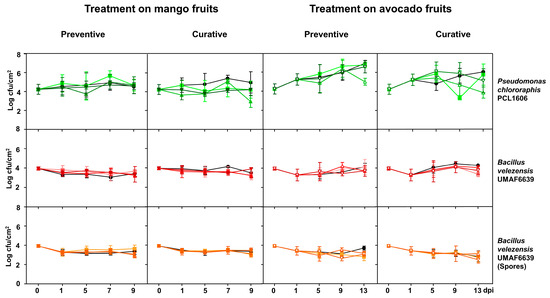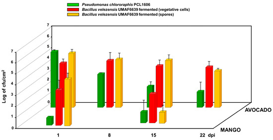 Bacterial counts obtained from fruits treated with preventive application in the field before harvest. Population of Pseudomonas chlororaphis PCL1606 (green) and Bacillus velezensis UMAF6639 (vegetative cells in red and spores in orange) after one day and fifteen days postinoculation (dpi) in mango fruits, and after one, eight, fifteen, and twenty-two days postinoculation (dpi) in avocado fruits.