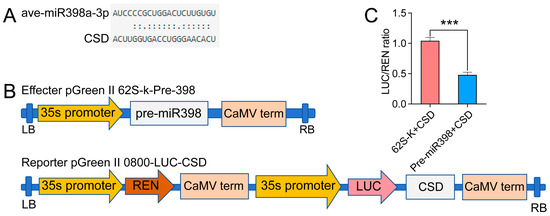 3.9. Dual-Luciferase Reporter Analysis Proving the Targeting Relation between miR398 and CSD2