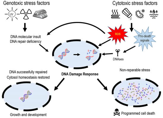 The influence of genotoxic and cytotoxic stress factors that act on cell DNA and the possible outcomes are schematically shown in Figure 1.