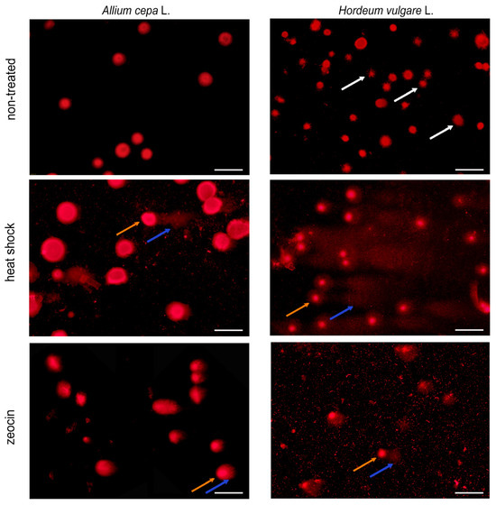 Neutral Comet assay analysis showing nuclei with comets in leaves of onion (Allium cepa) and barley (Hordeum vulgare) after DNA damage-inducing treatments. Nuclei were extracted from the leaves of onion or barley seedlings and were subjected to treatment by two stressors, heat shock (55 °C, 1 h) or the radiomimetic antibiotic zeocin (100 µg/mL, 24 h). Neutral comet assays (N/N protocol) were performed following the method of Menke et al. (2001) [114] with modifications; leaf nuclei were isolated according to Kubalová et al. (2021) [202] for barley and to Collins et al. (2023) for onion, with modifications [14]. For more information, see Supplementary Information File S1. Orange arrows point at the heads of comets, blue arrows at the tails of comets, and white arrows point at nuclei with slightly relaxed DNA. Scale bars: 100 µm.