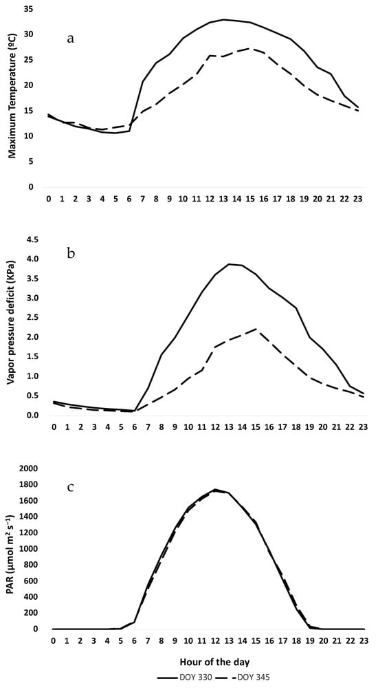 Hourly measurement of climatic variables for the day of the year (DOY) 330 and 345: (a) maximum temperature (°C); (b) vapor pressure deficit (VPD); (c) photosynthetically active radiation (PAR). Climatic data obtained from automatic weather station.
