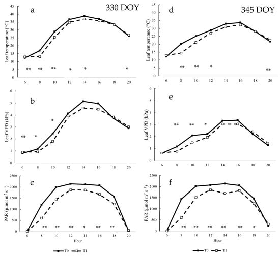 Daily measurement of ecophysiological variables determined in INIA-G2 grapevines for the day of the year (DOY) 330 (a–c) and 345 (d–f): (a,d) leaf temperature; (b,e) leaf vapor pressure deficit (VPD); (c,f) photosynthetically active radiation (PAR). T0: uncovered grapevines; T1: shading net treatment. ** Significant difference (p-value < 0.01). * Significant difference (p-value < 0.05).