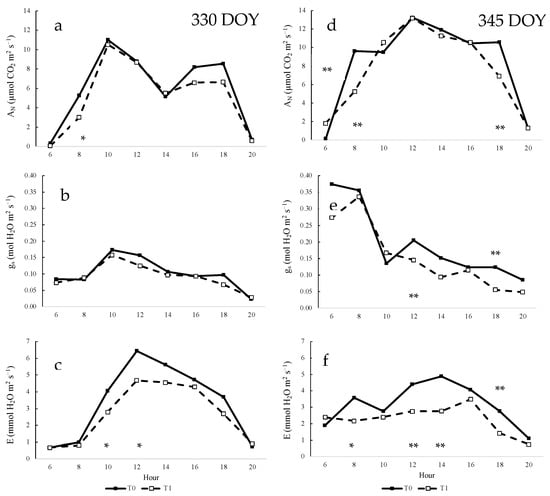 Daily measurement of gas exchange variables determined in INIA-G2 grapevines for the day of the year (DOY) 330 (a–c) and 345 (d–f): (a,d) net CO2 assimilation; (d,e) stomatal conductance (gs); (c,f) transpiration (E). T0: uncovered grapevines; T1: shading net treatment. ** Significant difference (p-value < 0.01). * Significant difference (p-value < 0.05).
