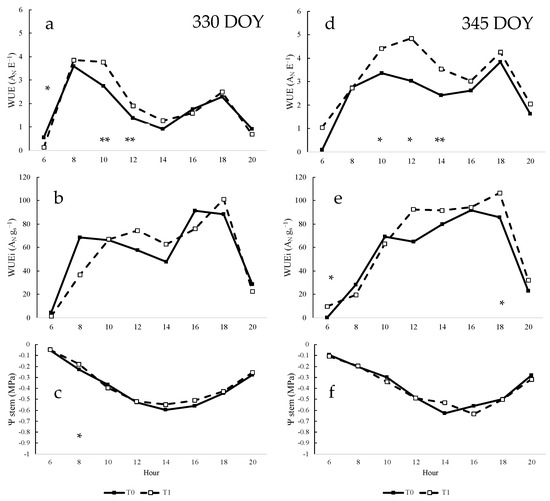 Daily measurement of water status variables determined in INIA-G2 grapevines for the day of the year (DOY) 330 (a–c) and 345 (d–f): (a,d) intrinsic water use efficiency (WUEi); (d,e) instantaneous water use efficiency (WUE); (c,f) stem water potential. T0: uncovered grapevines; T1: shading net treatment. ** Significant difference (p-value < 0.01). * Significant difference (p-value < 0.05).