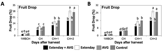 For each treatment and replication, two weeks before CH, a total of 5 limbs (from different trees) with a total of 20 fruits each were selected and tagged from either side of the trees. Preharvest fruit drop was evaluated by counting the number of tagged fruits weekly starting from one week before CH (1WBCH) to 2 weeks after CH (CH + 2). The percentage of fruit drop was then calculated relative to the initial fruit count per limb.