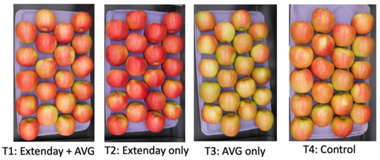 Particularly in this study, the distribution of each Extenday and AVG treatment combination/evaluation period along component 1 of the PCA is supported by the AVG-only-treated ‘Honeycrisp’ fruit displaying the significantly lowest IEC, most delayed fruit maturity, and reduced fruit drop but a drastically inhibited red skin coloration in all evaluation periods; followed by the Extenday + AVG treatment in ‘Honeycrisp’ fruit exhibiting an intermediate positioning in terms of IEC, fruit maturity (not leading to overripe fruit), and fruit drop, while significantly enhancing red skin coloration above the required marketable minimum (>50% blush) in all evaluation periods; by the control ‘Honeycrisp’ fruit showing a significantly increased IEC, fruit maturity (leading to overripe fruit towards the later assessed evaluation periods), and fruit drop, with a considerably hindered red skin coloration in the first evaluation periods; and finally by the Extenday-only-treated ‘Honeycrisp’ fruit, presenting the significantly highest IEC, most advanced fruit maturity (leading to overripe fruit), increased preharvest fruit drop, yet a promoted red skin coloration in all evaluation periods (>75% blush). However, the results of this study may only be applicable for fruit grown under US mid-Atlantic conditions. Thus, this work needs to be replicated in major production regions of ‘Honeycrisp’ with different environmental conditions, such as the Pacific Northwest, to assess the transferability of these outcomes between regions. Furthermore, these results are specific for ‘Honeycrisp’ fruit and future work is required to include a wide range of cultivars to assess the robustness of these results.