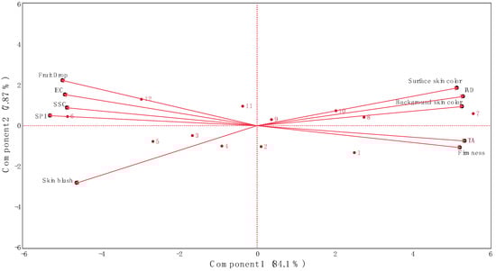The parameter of flesh firmness was positively associated with titratable acidity (r = 0.95), the color parameters of surface and background skin hue angles (r = 0.81 and r = 0.82, respectively), as well as IAD (r = 0.84). Furthermore, there was a significant negative correlation between flesh firmness and assessed fruit physicochemical properties such as SPI (r = −0.96) and SSC (r = −0.83), as well as with skin blush (r = −0.67).