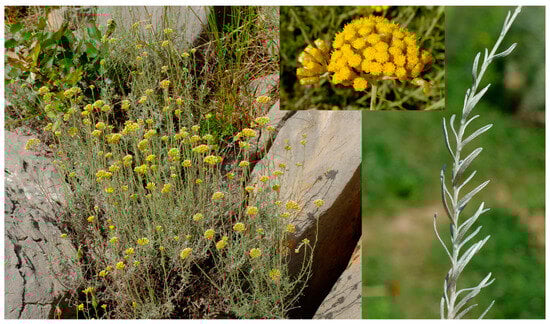 - Pljevljakušić, D.; Bigović, D.; Janković, T.; Jelačić, S.; Šavikin, K. Sandy everlasting (Helichrysum italicum (L.) Moench): Botanical, chemical and biological properties. Front. Plant Sci. 2018, 9, 1123. [Google Scholar] [CrossRef]