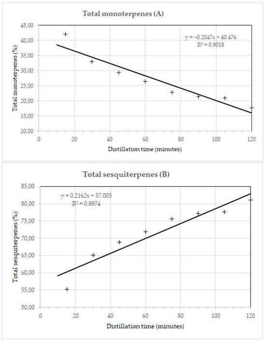 Significant differences between the fractions for the relative percentage of compounds were determined using one-way ANOVA followed by Tukey’s HSD post-hoc test (p < 0.05). The relationship between the individual groups of ingredients and the distillation time was evaluated using linear regression. The statistical analysis was carried out using the Statistica 7 software package (StatSoft Inc., Tulsa, OK, USA).
