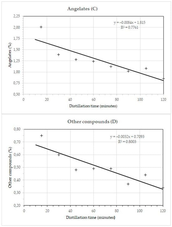 Dependence of total monoterpenes (A), total sesquiterpenes (B), angelates (C), and other compounds (D) in essential oil Helichrysum italicum on the duration of steam distillation. +, percentage of components in a particular fraction.
