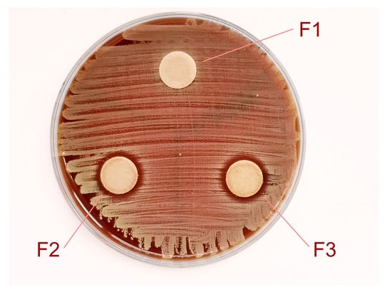 Antimicrobial activity of H. italicum essential oil on Staphylococcus aureus ATCC 25923. Fraction F1 without wide inhibition zone and fractions F2 and F3 with clear inhibition zones.