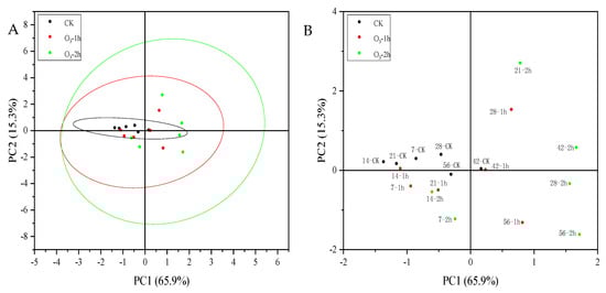 3.3.1. The Impact of Ozone Treatment on the Content of O2−. and H2O2 in C. pilosula
