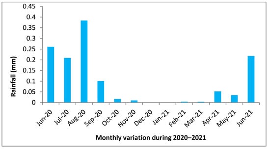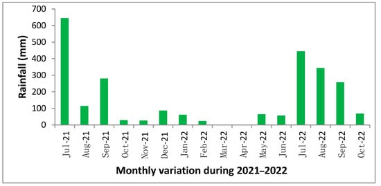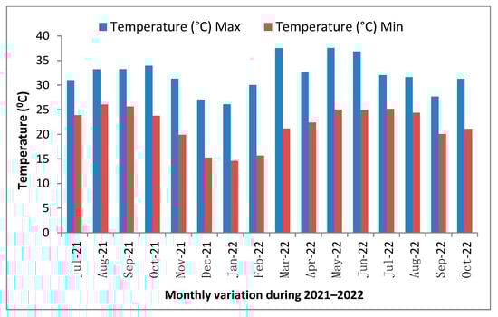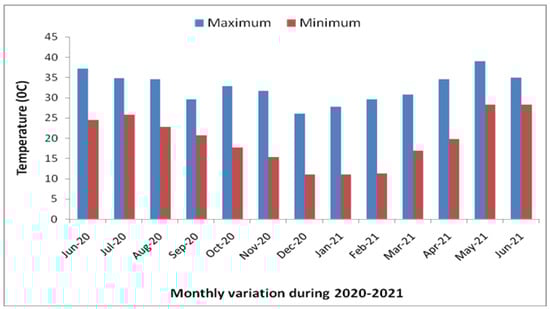 In the first week of December, just after the completed production of new leaves, the nutrients and bioregulators were applied. The climate of the experimental site was warm and semi-dry, with hot, dry summers and mild winters. The meteorological information gathered between 2020 and 2022 at the Regional Research and Technology Transfer Station (RRTTS), Chiplima, during the meteorological observational period is shown in Figure 1, Figure 2, Figure 3 and Figure 4.