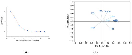 (A) Slope declining of the treatments from first treatment to last treatment; (B) Scattered graph of Principal Component Analysis for treatments (where, TFP—Total number of fruits per plat; TMF—Total number of marketable fruits; FD—Fruit drop; FRK—Fruit cracking; FR—Fruit retention; TSS—Total soluble solids; FRL—Fruit length; FB—Fruit width, ASC—Ascorbic acid.