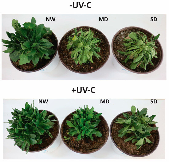 Effects of UV-C irradiation at 1 kJ m−2 (±UV-C) and drought stress (NW: normal watering, MD: moderate drought, SD: severe drought) on O. ecklonis plants. Pictures were taken at the end of the 7-week period.