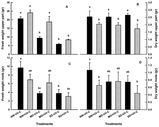 Fresh weight upper part ((A); gr), dry weight upper part ((B); gr), fresh weight roots ((C); gr) and dry weight roots ((D); gr) of O. ecklonis plants treated with UV-C irradiation at 1 kJ m−2 or left non-irradiated (controls) and cultivated at three different drought levels (NW: normal watering, MD: moderate drought, SD: severe drought). Data were recorded after the 7-week experimental period. Vertical bars are standard error of means, and different letters indicate the significant differences according to Duncan’s multiple range test at p = 0.05.