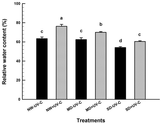 Relative water content (%) of O. ecklonis plants treated with UV-C irradiation at 1 kJ m−2 or left non-irradiated (controls) and cultivated at three different drought levels (NW: normal watering, MD: moderate drought, SD: severe drought). Data were recorded after the 7-week experimental period. Vertical bars are standard error of means, and different letters indicate the significant differences according to Duncan’s multiple range test at p = 0.05.