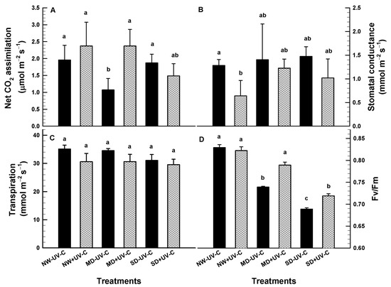 Net CO2 assimilation ((A); μmol m−2 s−1), stomatal conductance ((B); mmol m−2 s−1) transpiration ((C); mmol m−2 s−1) and chlorophyll fluorescence ((D); Fv/Fm) of O. ecklonis plants treated with UV-C irradiation at 1 kJ m−2 or left non-irradiated (controls) and cultivated at three different drought levels (NW: normal watering, MD: moderate drought, SD: severe drought). Data were recorded on the 4th week of the experiment. Vertical bars are standard error of means, and different letters indicate the significant differences according to Duncan’s multiple range test at p = 0.05.