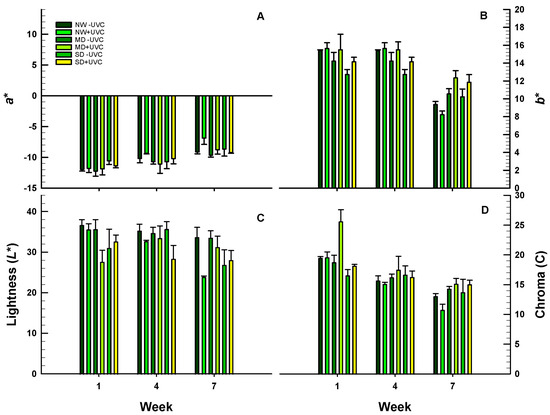 Colour parameters of a* (A), b* (B), lightness (L*; C) and chroma (C; D) of O. ecklonis leaves treated with UV-C irradiation at 1 kJ m−2 or left non-irradiated (controls) and cultivated at three different drought levels (NW: normal watering, MD: moderate drought, SD: severe drought). Data were recorded on the 1st, 4th and 7th week. Vertical bars are standard error of means.