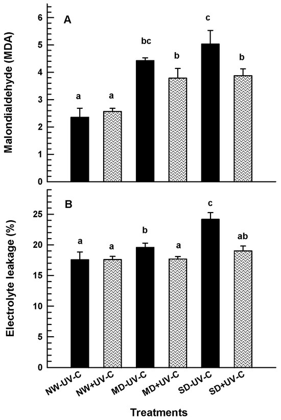 Malondialdehyde (A) and electrolyte leakage ((B); %) of O. ecklonis plants treated with UV-C irradiation at 1 kJ m−2 or left non-irradiated (controls) and cultivated at three different drought levels (NW: normal watering, MD: moderate drought, SD: severe drought). Data were recorded after the 7-week experimental period. Vertical bars are standard error of means, and different letters indicate the significant differences according to Duncan’s multiple range test at p = 0.05.