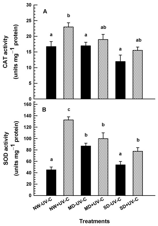 Significant antioxidant enzyme activity was recorded in plants irradiated with 1 kJ m−2 (Figure 9). SOD and CAT activity was induced by UV-C at all levels of drought. CAT activity in the NW plants was increased from 16.76 to 23.1 units mg−1 protein after UV-C irradiation (Figure 9A). Drought stress did not increase the production of CAT in the irradiated and the non-irradiated plants. Likewise, at NW, UV-C irradiation boosted SOD production by 3-fold (Figure 9B). SOD activity was induced at the MD conditions in the non-irradiated plants, while the UV-C treated plants showed a gradual reduction of SOD values.