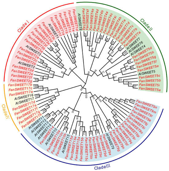 Phylogenetic tree of SWEET family of F. × ananassa and A. thaliana. All SWEET proteins are divided into four clades (I, II, III, and IV), which are represented by different colored backgrounds. At stands for A. thaliana, Fan stands for F. × ananassa, and FanSWEET proteins are marked in red font.