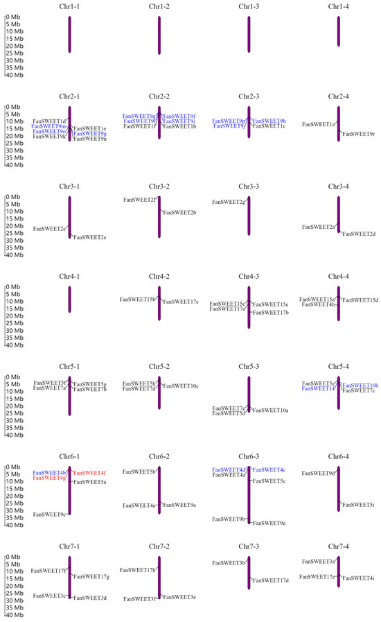 Chromosome localization of SWEET family members in F. × ananassa. The chromosome number is shown above each chromosome. Purple vertical bars with different lengths indicate F. × ananassa chromosomes, black short lines indicate the position of each FanSWEET, blue fonts indicate tandem genes, and red fonts indicate tandem repetitive genes. The scale bars beside the chromosome indicate the length of megabases (Mb). The arrows show the transcription directions of FanSWEET genes.