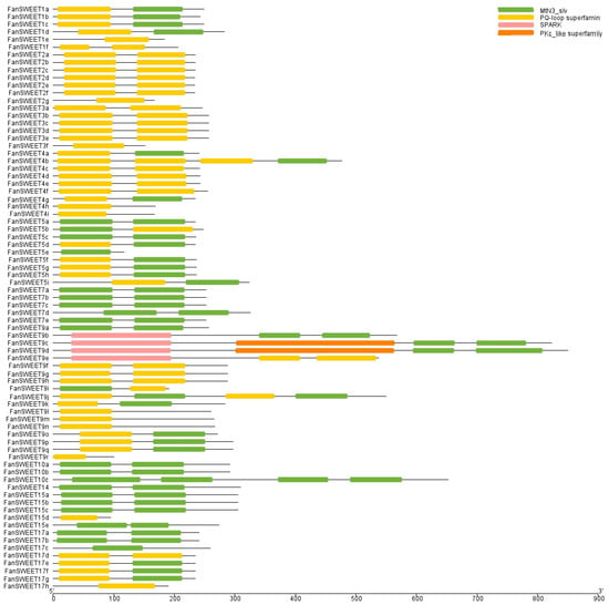 By conservative domain analysis (Figure 3), it is found that members of the SWEET family generally have two typical domains, the MtN3_slv or PQ-loop superfamily. Meanwhile, FanSWEET1e/2g/3f/4h/4i/5e/9l/9m/9n/9r/15d/17c and 17h have only one structural domain, and FanSWEET4b, FanSWEET9j, and FanSWEET10c have four SWEET family typical structural domains. FanSWEET members homologous to AtSWEET2 and AtSWEET3 only have the PQ-loop superfamily structural domains and not the MtN3_slv structural domain. Furthermore, FanSWEET9b-9e contain a SPARK domain, and FanSWEET9c and FanSWEET9d also have the PKc_like superfamily. It can be seen that the structural domains of the FanSWEET protein family are conserved to a certain extent, but the number and distribution of the structural domains are somewhat differentiated.