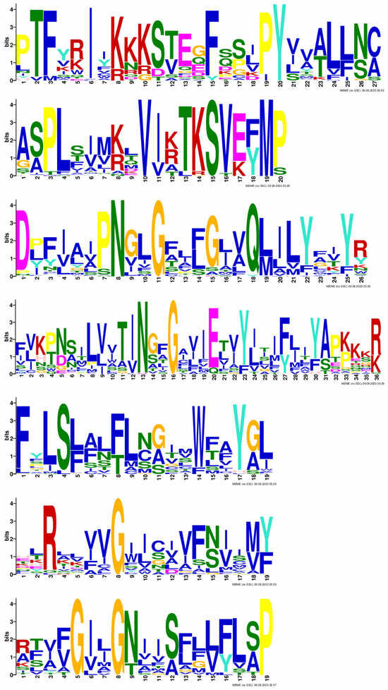Identification of conservative motif sequences of SWEET family members of F. × ananassa. The bigger the letter of amino acid, the more conservative it is. The size of different amino acids in the same position is scaled according to their frequency.
