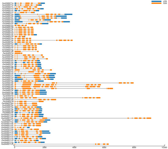Genetic structure of SWEET family members of F. × ananassa. The orange box indicates the exon, the black line indicates the intron, and the blue box indicates the untranslated 5′- or 3′-region.