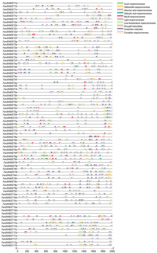 Homeopathic elements of SWEET family members of F. × ananassa. Different colored boxes represent different cis-acting elements.