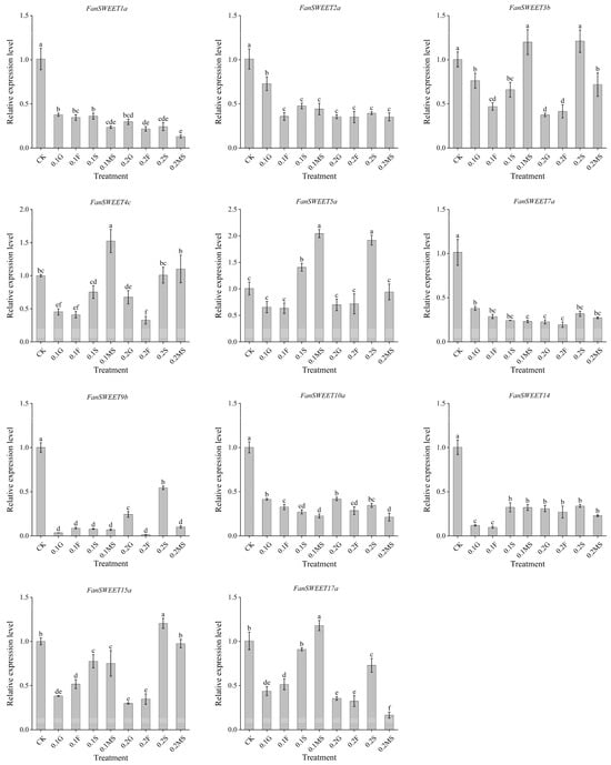 Expression of the FanSWEET genes in ‘Yanli’ strawberry leaves treated with exogenous sugar. CK is clear water control, with 0.1 G representing 0.1 mol∙L−1 glucose, 0.1 F representing 0.1 mol∙L−1 fructose, 0.1 S representing 0.1 mol∙L−1 sucrose, 0.1 MS representing 0.1 mol∙L−1 mixed sugar, 0.2 G representing 0.2 mol∙L−1 glucose, 0.2 F representing 0.2 mol∙L−1 fructose, 0.2 S representing 0.2 mol∙L−1 sucrose, and 0.2 MS representing 0.2 mol∙L−1 mixed sugar. The letters above the bars indicated the significant differences by student’s t-test (p < 0.05). Three biological replicates were analyzed, and the error bars represented the SD.