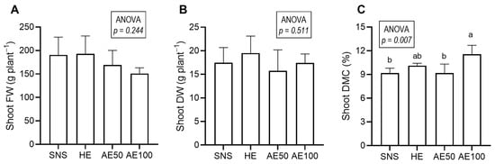 Shoot fresh (A) and dry weight (B), and dry matter content (C, DMC; DW/FW%) of Salicornia europaea plants grown in pots in a greenhouse and irrigated with standard nutrient solution (SNS) or the effluent from a semi-closed substrate culture of tomato (HE) or a recirculating aquaculture system with Gilthead Sea bream, which was used as such (AE100) or diluted (50:50) with tap water (AE50). Mean values (n = 3; ±SE) flanked by different letters were statistically different for p ≤ 0.05 (Tuckey’s test).