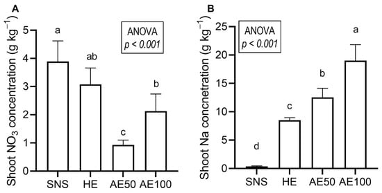 Shoot concentration (on a fresh weight basis) of nitrate (NO3, A) and sodium (Na, B) in Salicornia europaea plants grown in pots in a greenhouse and irrigated with standard nutrient solution (SNS) or the effluent from a semi-closed substrate culture of tomato (HE) or a recirculating aquaculture system with Gilthead Sea bream, which was used as such (AE100) or diluted (50:50) with tap water (AE50). Mean values (n = 3; ±SE) flanked by different letters were statistically different for p ≤ 0.05 (Tuckey’s test).
