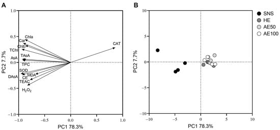 The relationship between the analyzed parameters is shown by the scores reported in Figure 3B. Two main groups were distinguished by PC1 and PC2. The negative side of PC1 is constituted by SNS treatment, which showed the highest concentration of pigments, ascorbic acid, phenolic compounds, H2O2, TEAC, and MDA, and the highest activity of SOD. The right half of the plot (positive side of PC1) is related to HE, AE50, and AE100 plants, which showed the highest CAT activity.