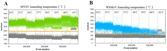 Optimization of the annealing temperature for the ddPCR assay. To determine the optimal annealing temperature, annealing temperatures of 54, 55, 56, 57, 58, 59, 60, and 61 °C were assessed. Light green dots represent the positive MYSV (A); blue dots represent the positive WSMoV (B); the orange line indicates the threshold; the droplets above the lines are positives (blue and light green dots), and the droplets below lines are positives and negatives (gray dots). The X and Y coordinates indicate the number of droplets and fluorescence signal intensity, respectively.