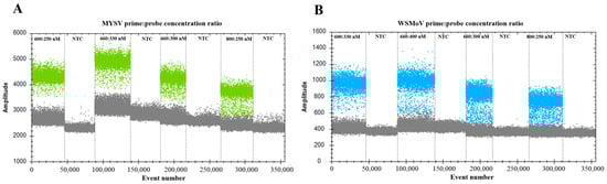 To further construct the detection system for MYSV and WSMoV, the concentration of primers and probes was optimized. When the concentration ratios of MYSV and WSMoV primers and probes were 600:250 (Figure 2A) and 600:330 nM (Figure 2B), respectively, in the same system, the fluorescence amplitudes between positive and negative droplets indicated the optimal separation. Therefore, the optimal temperature and concentration of primers and probes were 55 °C and 600:250 nM for MYSV and 600:330 nM for WSMoV, respectively, for the subsequent ddPCR assay.
