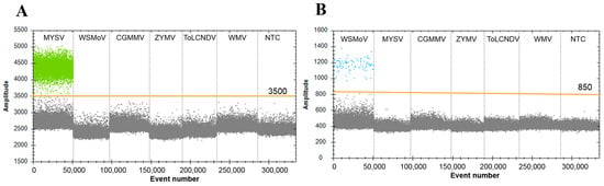Evaluation of the specificity of detection of MYSV and WSMoV in ddPCR assay. (A) The specificity of detection of MYSV and (B) the specificity of detection of WSMoV. Each sample is divided by orange lines. The fluorescence amplitudes of watermelon silver mottle virus (WSMoV), melon yellow spot virus (MYSV), cucumber green mottle mosaic virus (CGMMV), zucchini yellow mosaic virus (ZYMV), tomato leaf curl New Delhi virus (ToLCNDV), watermelon mosaic virus (WMV), and the no-template control (NTC) are indicated.