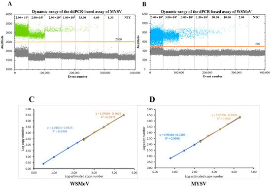 To assess the linearity of the ddPCR quantification, the log copy number data against log dilution were fitted to a linear regression model. Serially diluted pTOPO-WSMoV and pTOPO-MYSV plasmids exhibited good linearity in qPCR and ddPCR assays. The dynamic range of the ddPCR-based assay for MYSV and WSMoV was good in ddPCR (Figure 4A,B). Moreover, the standard curves of WSMoV and MYSV in ddPCR had regression of Y = 1.0167X − 0.0425 (R2 = 0.9998) and Y = 0.9928X + 0.0186 (R2 = 0.9996), respectively (Figure 4C). In qPCR, the standard curves of WSMoV and MYSV had regression of Y = 1.0469X − 0.1655 (R2 = 0.9971) and Y = 1.0579X − 0.1808 (R2 = 0.9981), respectively (Figure 4D). The results indicated that the linear regression model exhibited a good linear correlation with the varying concentrations of targets.