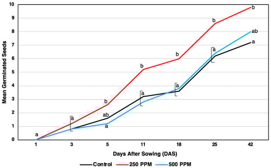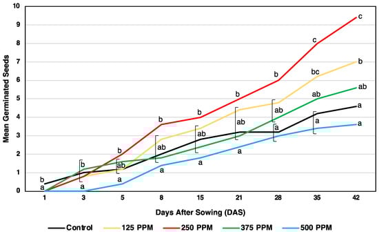 Graphic representation of the mean germinated seeds per plate and per treatment over time in the germination experiment. The same letter between treatments in the same DAS indicates no significant differences according to the LSD post hoc test. Error bars were omitted to obtain a more explicit graph. All data are provided in Supplementary Table S1.