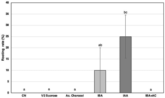 Graphic representation of the difference in rooting percentage between treatments in the exploratory rooting experiment. CN = control group, AC = activated charcoal. The same letter between treatments indicates no significant differences according to the LSD post hoc test.