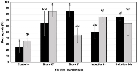 The statistical analysis of the results showed the effect of the treatments on the rooting response (Figure 4). Treatments of 30 s shock, 2 min shock, and 24 h induction significantly differed from the positive control in the case of in vitro explants. In contrast, for the greenhouse explants, the treatments of 30 s of shock and 6 h of induction were different from the positive control group (Figure 3, LSD test). The optimum treatment was the 30 s shock with IAA at 1 mg/mL for the greenhouse explants with a rooting of 85%, while the 2 min shock was better for the in vitro plants with a rooting of 85%.