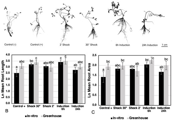 Regarding root length, the 6 h induction produced the longest roots for both in vitro and greenhouse-sourced explants (Figure 5B). Also, the 30 s shock in greenhouse explants grew longer than in the control group. Considering root area, the treatment with the best overall results was the 6 h of induction for both in vitro and greenhouse-sourced explants (Figure 5C).