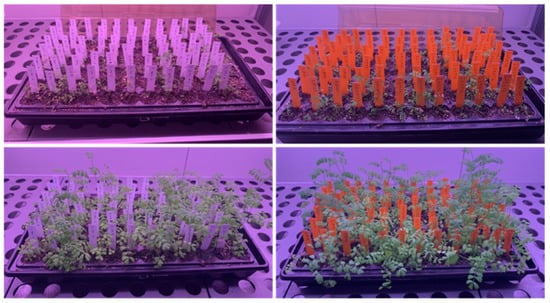 Acclimatation experiment. (Left up)—freshly transferred plants from tissue culture to mini greenhouses derived from sourced explants. (Left Down)—one-month acclimated plants derived from in vitro-sourced explants. (Right up)—freshly transferred plants from tissue culture to mini-greenhouses derived from greenhouse-sourced explants. (Right down)—one-month acclimated plants derived from greenhouse-sourced explants.
