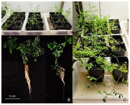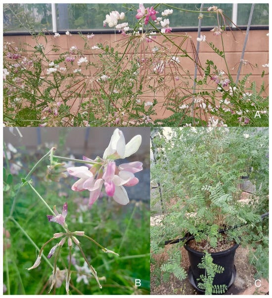 Coronilla viminalis Salisb. is a forage legume native to the Canary Islands and Morocco. It grows in cracks and ledges on cliffs, in poor or underdeveloped soil, forming part of rocky communities; it is generally observed in halophilic environments []. This legume is very appreciated by wild animals, and it is actively sought as food by rabbits and Moorish squirrels during the dry season, probably because of its high protein content [,,]. Moreover, in C. viminalis, the contents of the essential elements, such as phosphorus (P), calcium (Ca), magnesium (Mg), sodium (Na), and nitrogen (N), are within suitable ranges for its use as fodder for ruminant feeding [,]. Therefore, it shows great potential as a forage plant due to its ability to thrive in adverse climatic conditions and its good nutritional values, making it a suitable candidate for cultivation in arid and saline areas.