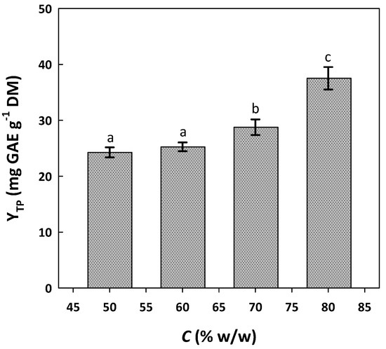 Effect of DES/water proportion (C) on the yield of total polyphenol extraction (YTP) from WOP. Extractions were accomplished at 70 °C, for 120 min, under stirring at 500 rpm. Columns designated with different letters (a, b, c) display statistically different levels (p < 0.05).